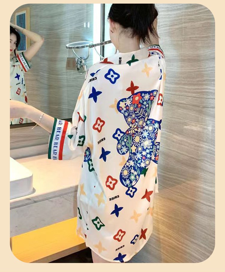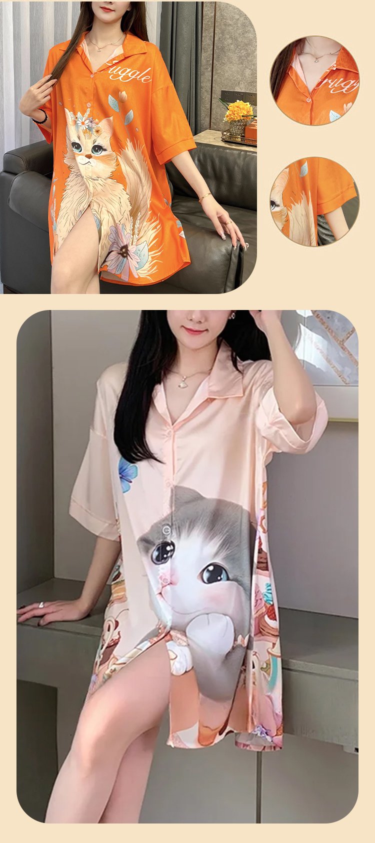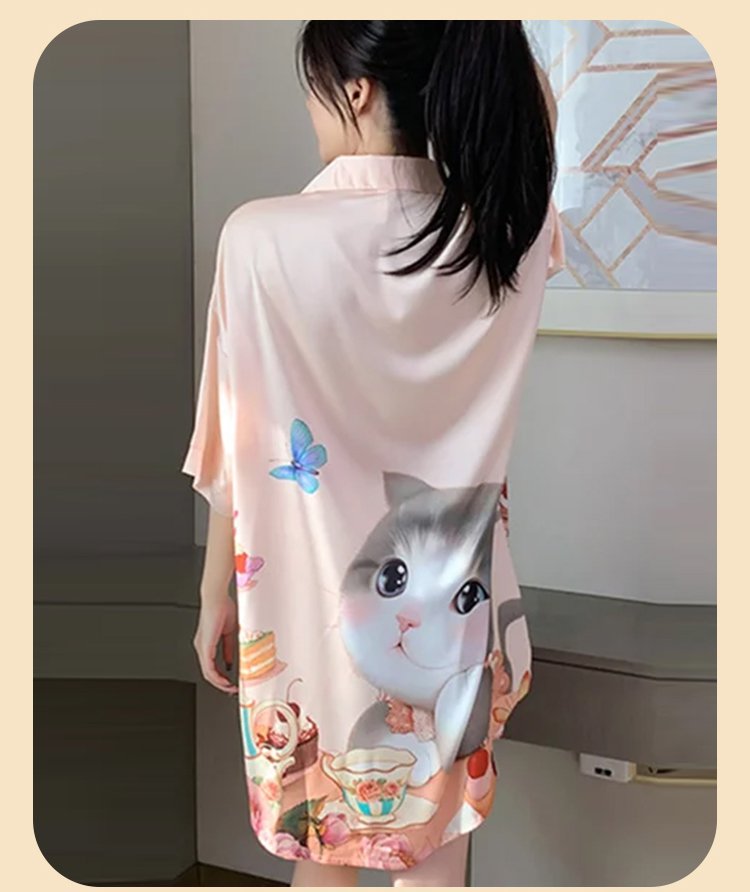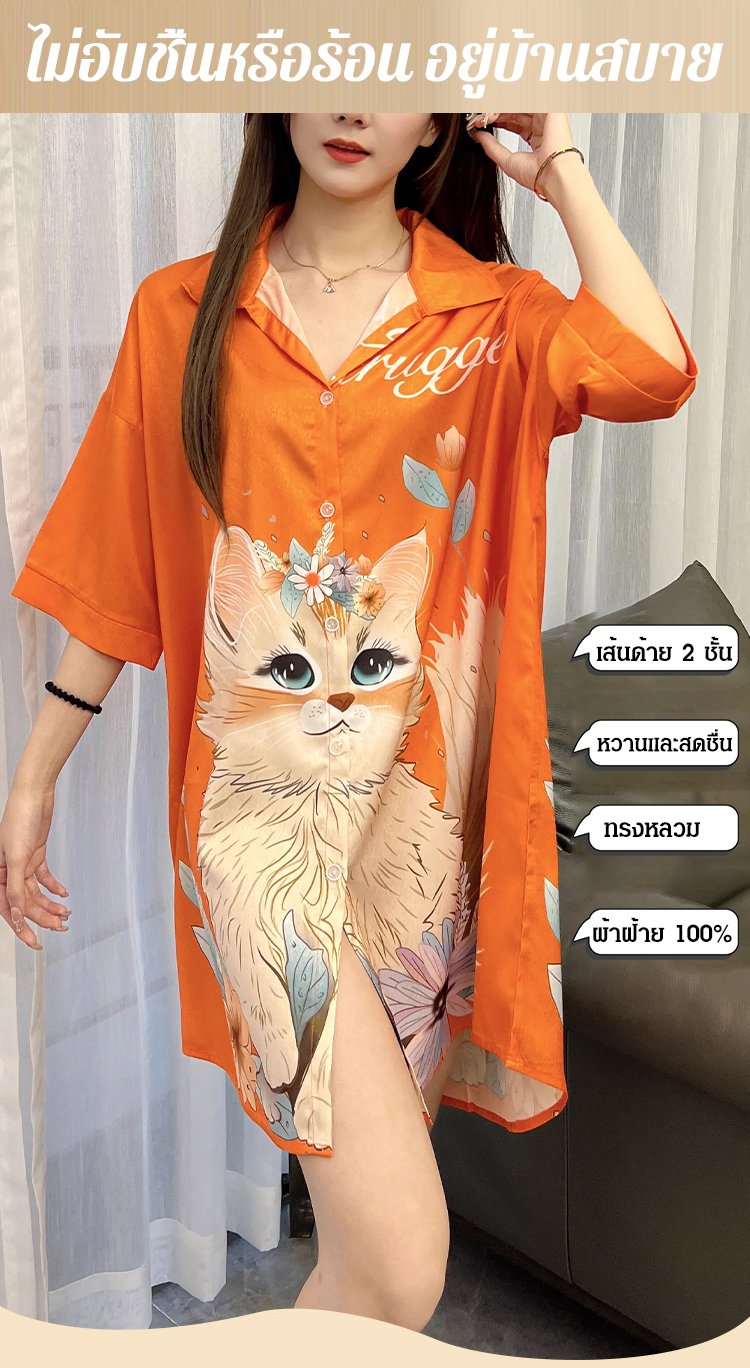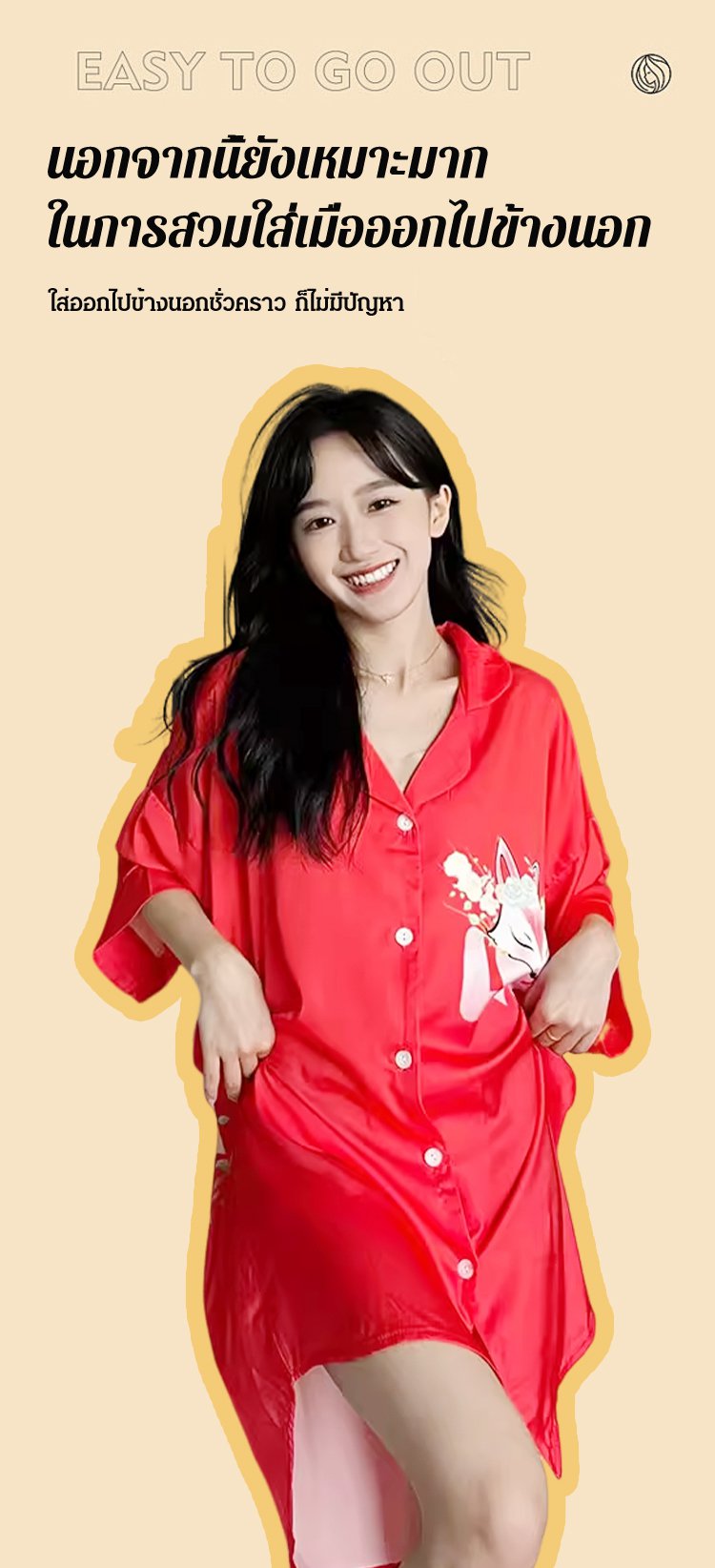 ชุดนอนเสื้อเชิ้ตสไตล์ฝรั่งเศสยาวปานกลางบางเฉียบ